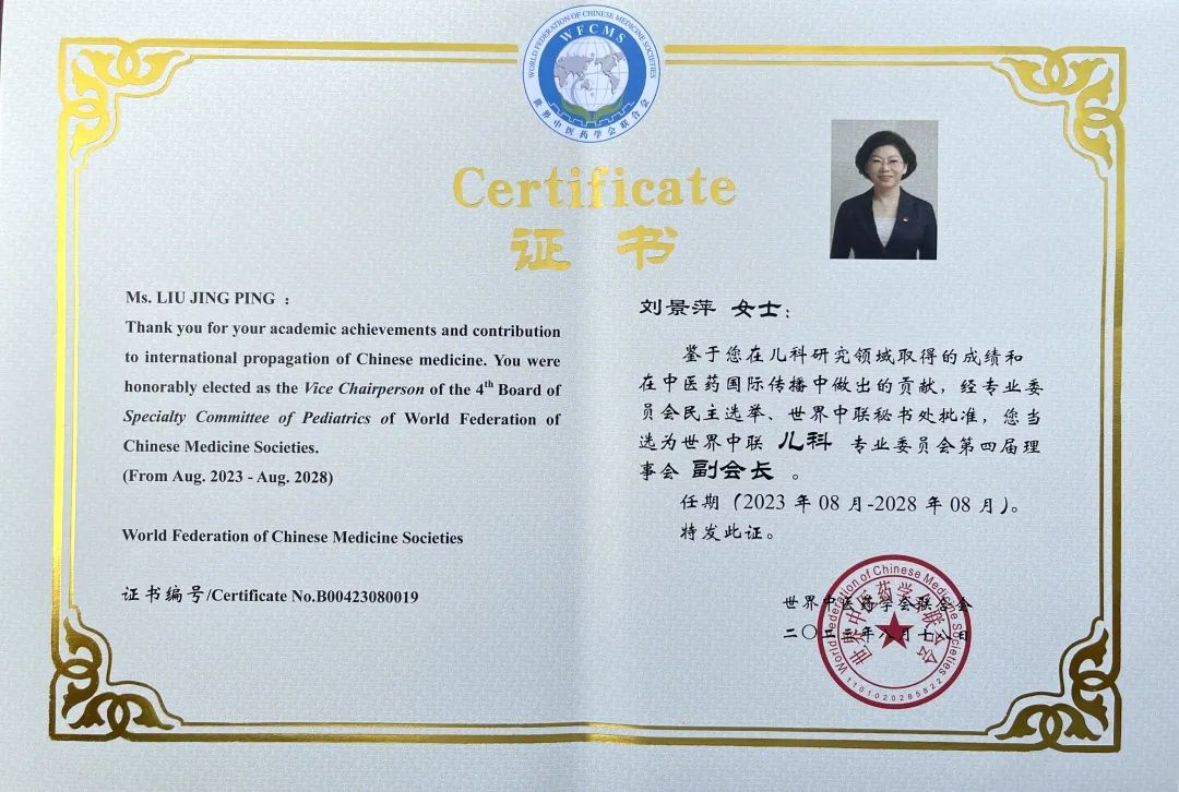 3377体育药业集团党委书记、董事长刘景萍当选世界中医药学会联合会儿科专业委员会第四届理事会副会长
